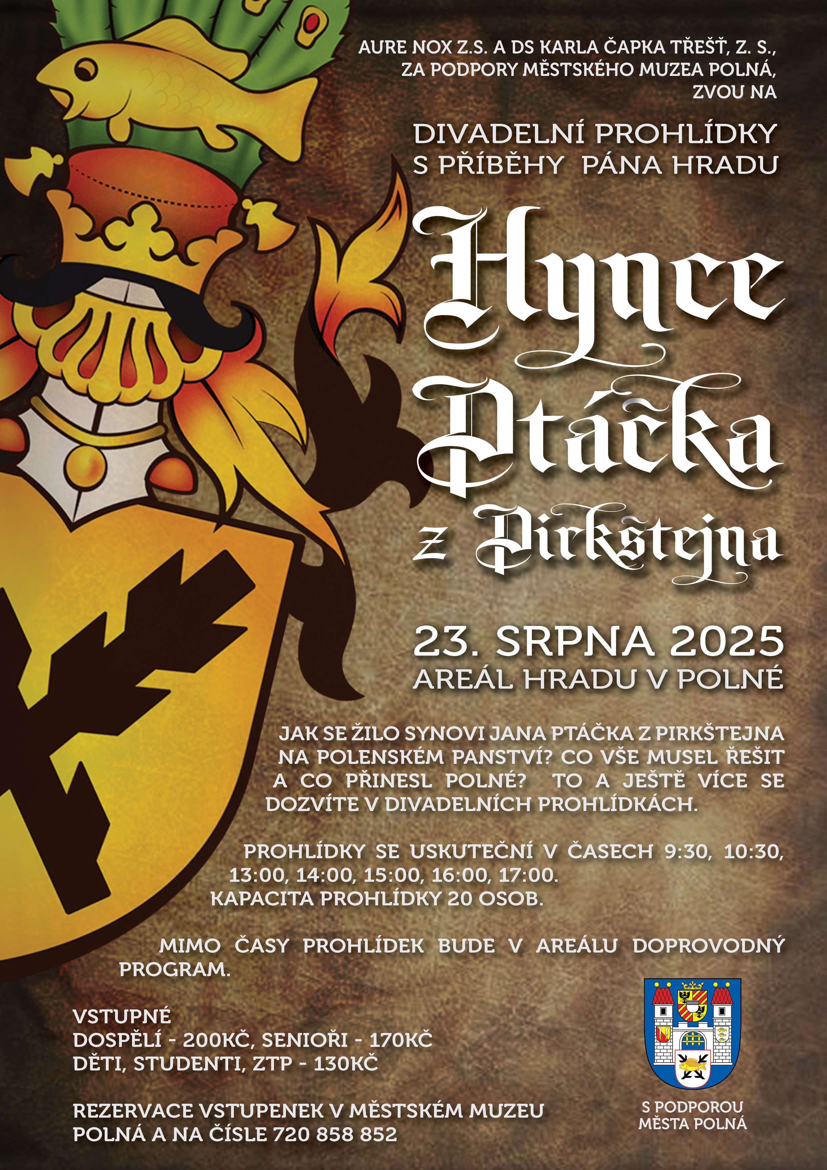Přijďte si užít polenský hrad jinak! Přijďte si zažít divadelní představení na hradě! Přijďte se seznámit s Hyncem Ptáčkem z Pirkštejna - bývalým hradním pánem, jehož výročí si letos připomínáme. Čeká Vás prohlídka hradem, divadelně zpracovaný příběh a bohatý doprovodný program na nádvoří. Vše pod taktovkou AURE NOX a DS Karla Čapka z Třeště, z.s.