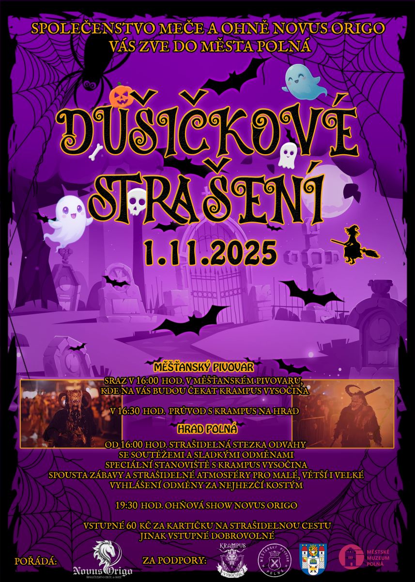 1. listopadu se z Měšťanského pivovaru , kde bude sraz v 16 hodin, vydá průvod všemožných zjevení směrem na hrad, kde se odehraje stezka odvahy, spousta strašení a dovádění na nádvoří. Všechny nebojácné děti a dospělé zve Novus Origo.