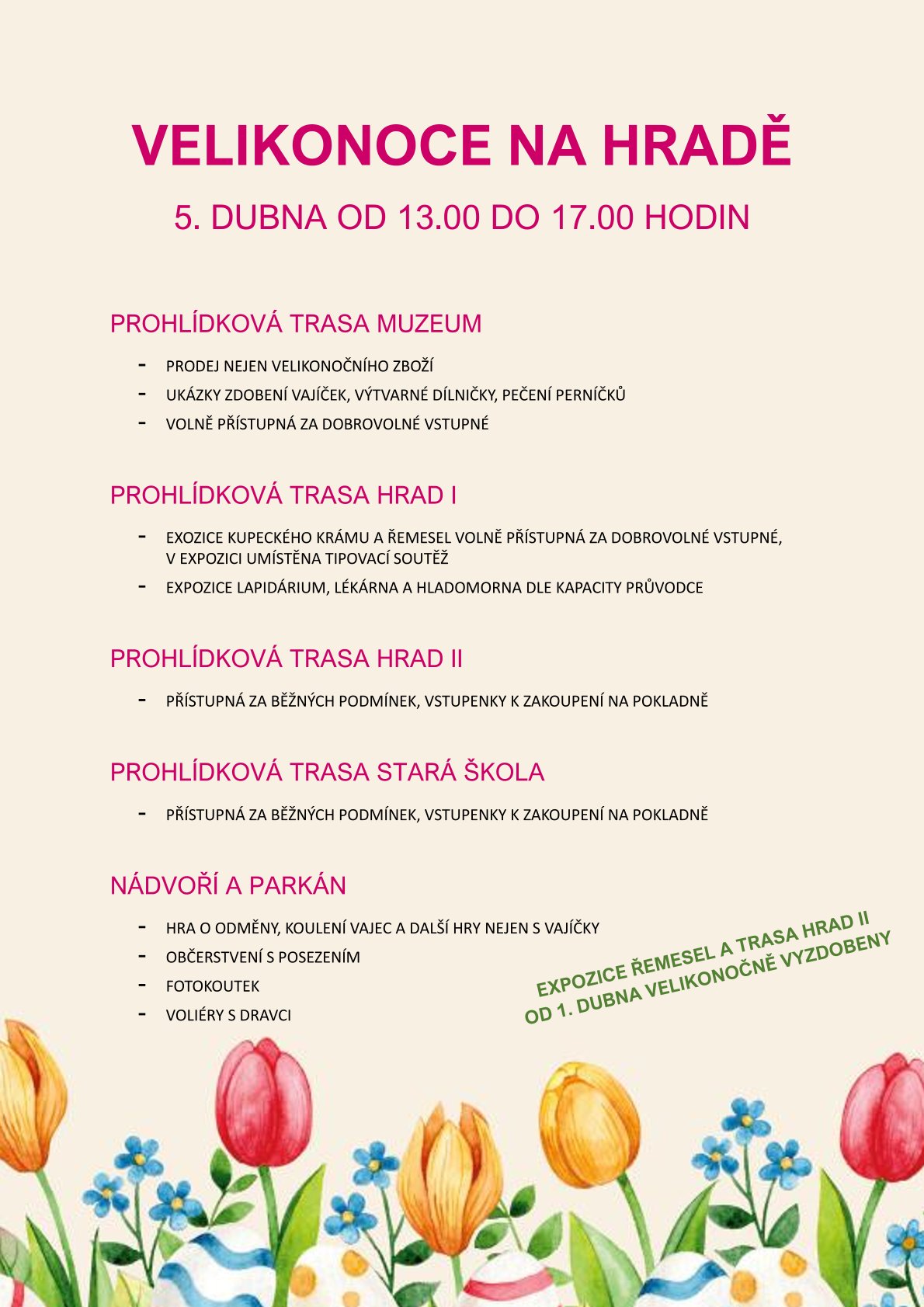 V neděli 5. dubna se můžou malí i velcí, rodiny s dětmi i milovníci svátků jara těšit na VELIKONOCE NA HRADĚ - akci, která připomíná tradici velikonočních svátků v lidové kultuře a místní paměti. Můžete si přijít zkusit koulet vejce, což byla oblíbená polenská kratochvíle, konaná pravidelně však až o velikonočním pondělí s vyhodovanými vejci. Budou na Vás čekat vyzdobené expozice, malý tématický jarmark, tvořivé dílny pro nejmenší, pečení perníků z dřevěných forem, zábavné aktivity na nádvoří a rovněž skvělé občerstvení!