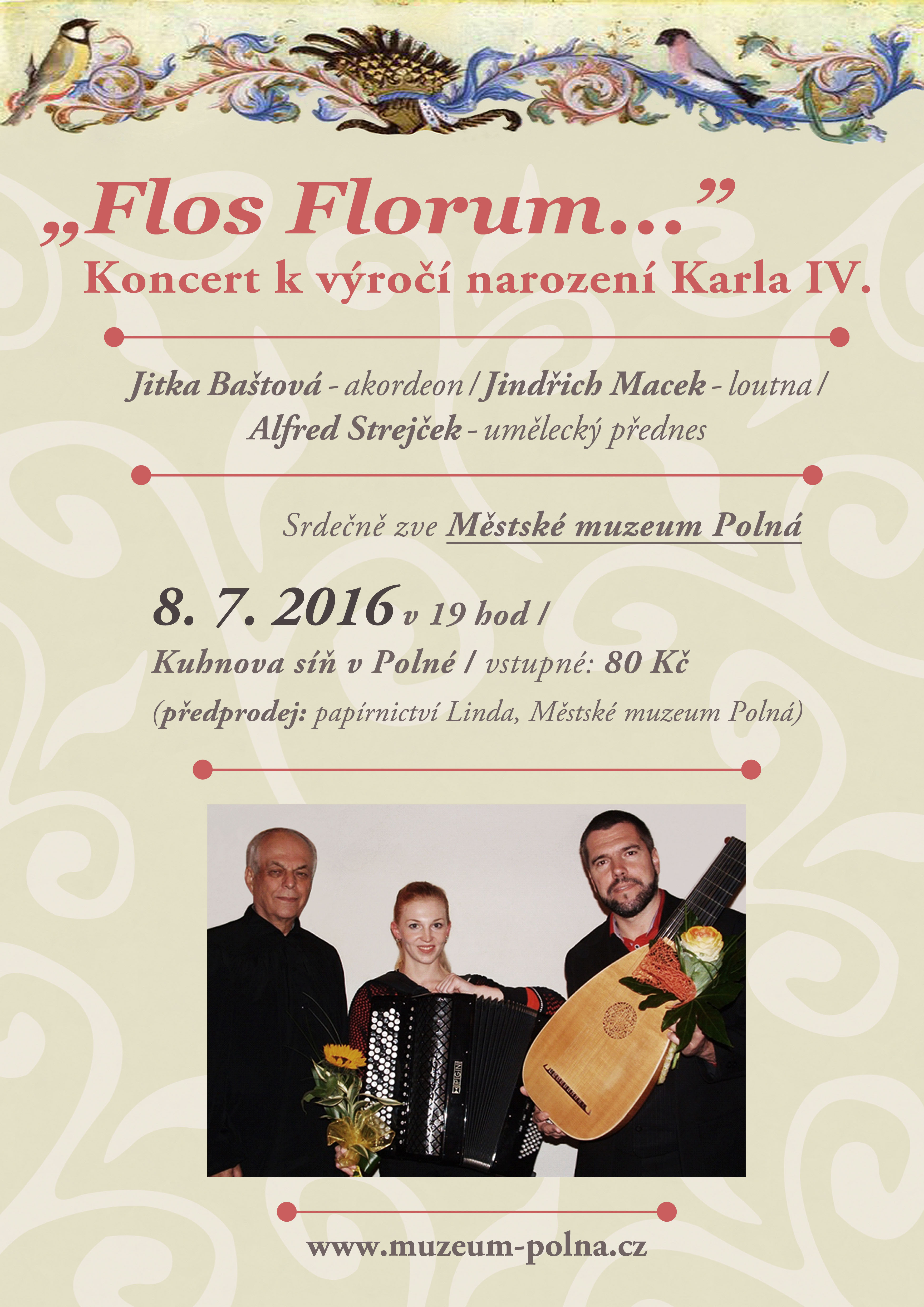 - koncert k výročí narození Karla IV. V podání Jitky Baštové (akordeon) a Jindřicha Macka (loutna) zazní skladby s rukopisu Vyšebrodského a jiných rukopisů z počátku 15. století, výběr z Jistebnického kancionálu, renesanční písně J. Dowlanda, kompozice D. Scarlattiho, L. Bernátha a dalších autorů. Hudební zážitek doplní umělecký přednes českého herce s jedinečným hlasovým projevem Alfreda Strejčka.